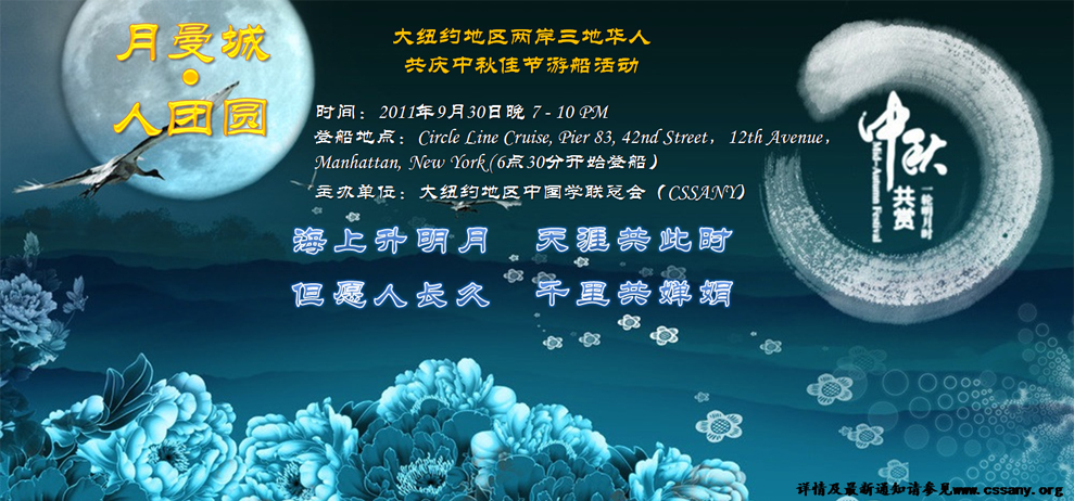 “露从今夜白,月是故乡明”,同为身在海外的炎黄子孙,中华儿女,每逢佳节倍思亲。同一轮明月,“照”就了同样的情怀。不论来自何处,在这个日子里,我们心中都充满了对家乡的思念和对团圆的向往。“情人怨遥夜,竟夕起相思”,孤身在外的漂泊游子,眼见月曼城,心系人团圆。大纽约学联继2010年中秋游船活动取得圆满成功之后,于今年再度举办“月曼城·人团圆环曼哈顿游轮赏月活动”,诚邀各界友人,两岸三地炎黄子孙共同参加,希望同广大海外游子一起寄托思乡之情,并借此为只只单飞燕搭起座座鹊桥,早日团圆。